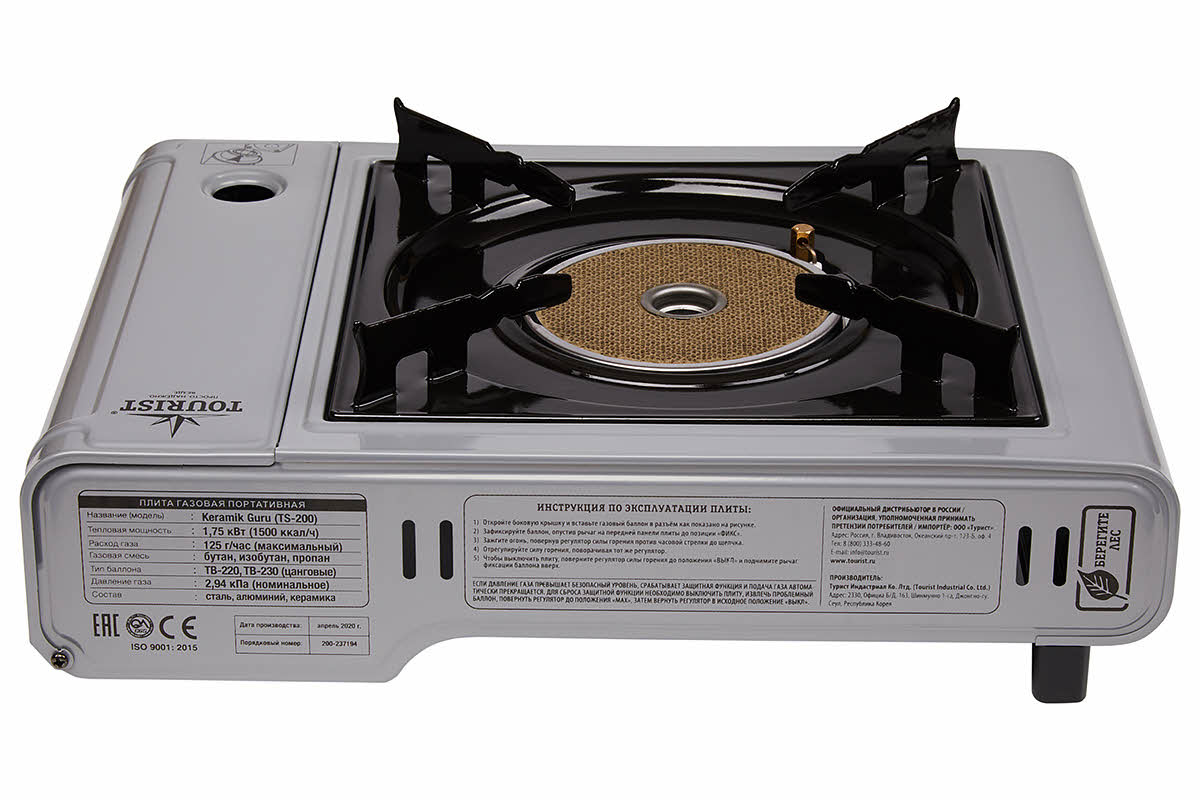 Наша продукция сертифицирована по международным стандартам. В соответствии с южнокорейскими требованиями (а именно там произведены плиты Tourist) уровень выделения СО (угарного газа) низкий – не выше 990 мг/м³. Значит можно использовать плиту в доме или на даче. Благо, Keramik Guru Plus работает не только от портативных газовых баллонов, но и от бытовых, объемом от 5 до 50 литров.