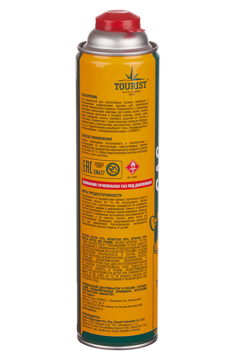 Одноразовый газовый баллон с клапаном резьбового типа с повышенным содержанием пропана для повышения температуры пламени. Применяется с горелками, резаками, паяльными лампами для пайки, резки, сварки легкоплавких металлов и сплавов (свинец, олово, цинк, медь, алюминий, золото, серебро), изделий из стекла и пластмасс. Совместим с туристическим газовым оборудованием (плиты, светильники, обогреватели, горелки, грили и т.д.) с подключением резьбового типа. Изготовлен в Южной Корее.