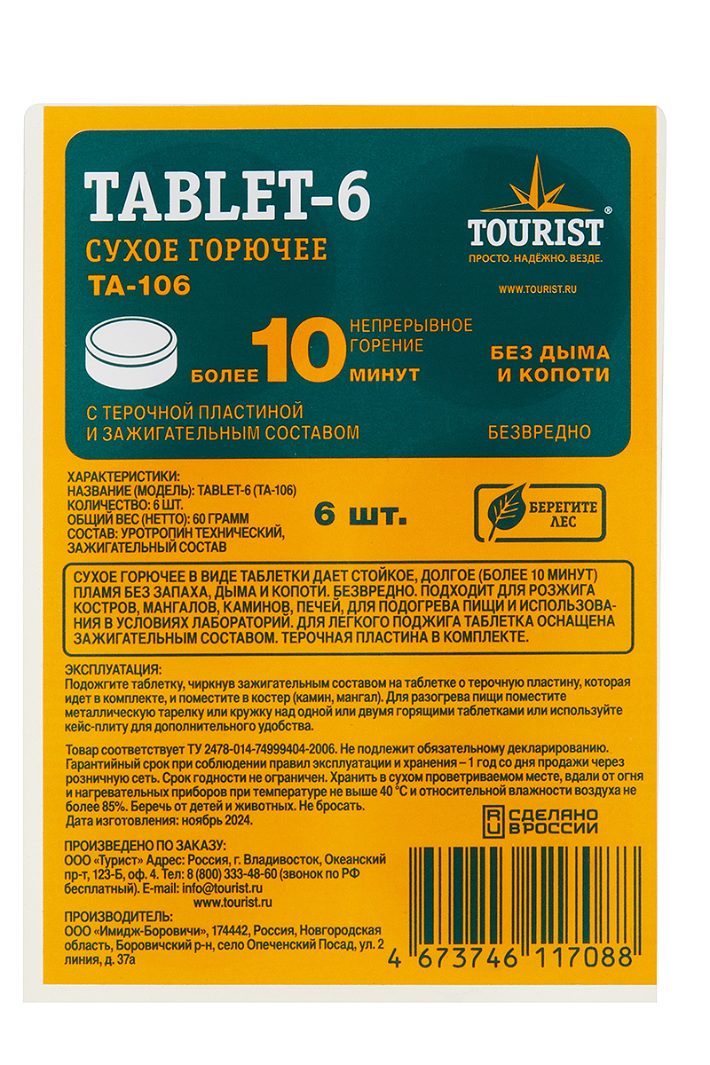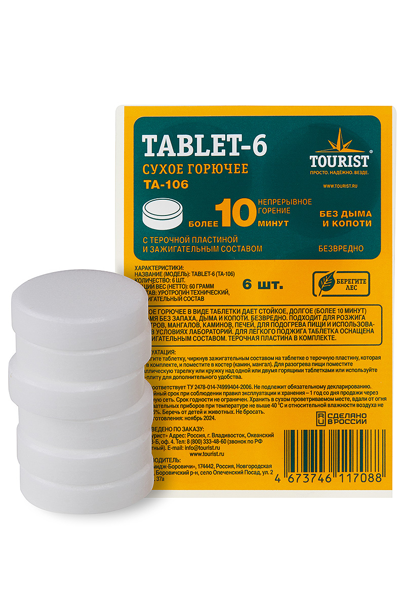 Сухое горючее в виде таблетки дает стойкое, долгое (более 10 минут) пламя без запаха, дыма и копоти. Безвредно. Подходит для розжига костров, мангалов, каминов, печей, для подогрева пищи и использования в условиях лабораторий. Для легкого поджига таблетка оснащена зажигательным составом. Терочная пластина в комплекте.