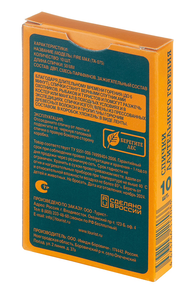 Благодаря длительному времени горения (до 6 минут), спички станут верными спутниками охотников, рыбаков и туристов и помогут разжечь костер или мангал в походных условиях и в экспедициях. Спички изготовлены из прессованных древесных волокон и пропитаны горючим составом. В коробок уложены в виде ленты.