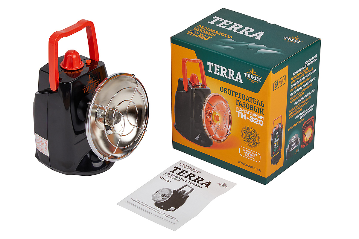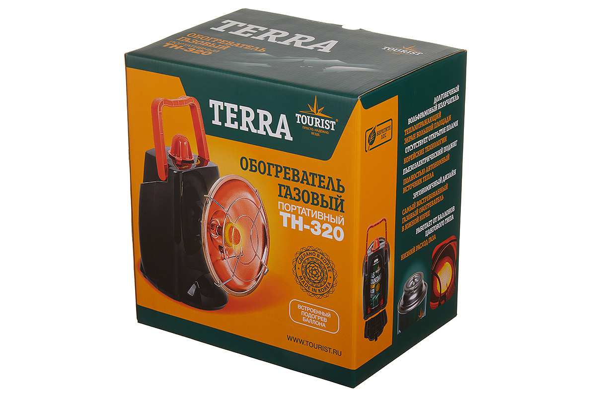 Компактный газовый обогреватель с низким расходом газа Terra (TH-320) предназначен для обогрева окружающего пространства и может использоваться на пикнике, в походе, на дачном участке, в дальней дороге и просто во время отдыха на природе. Портативный обогреватель имеет лёгкий вес и очень удобен в использовании. Работает от стандартного одноразового газового баллона цангового типа, который размещается внутри прибора. Отличительной особенностью данного обогревателя является применение технологии подогрева газового баллона: специальная металлическая пластина присоединена к инфракрасному излучателю и располагается в приборе за газовым баллоном. Обладая высокой теплопроводностью, пластина быстро нагревается от работающего излучателя и подогревает газ в баллоне. Благодаря технологии подогрева газового баллона, обогреватель отлично работает при низких температурах, а газовая смесь расходуется без остатка.