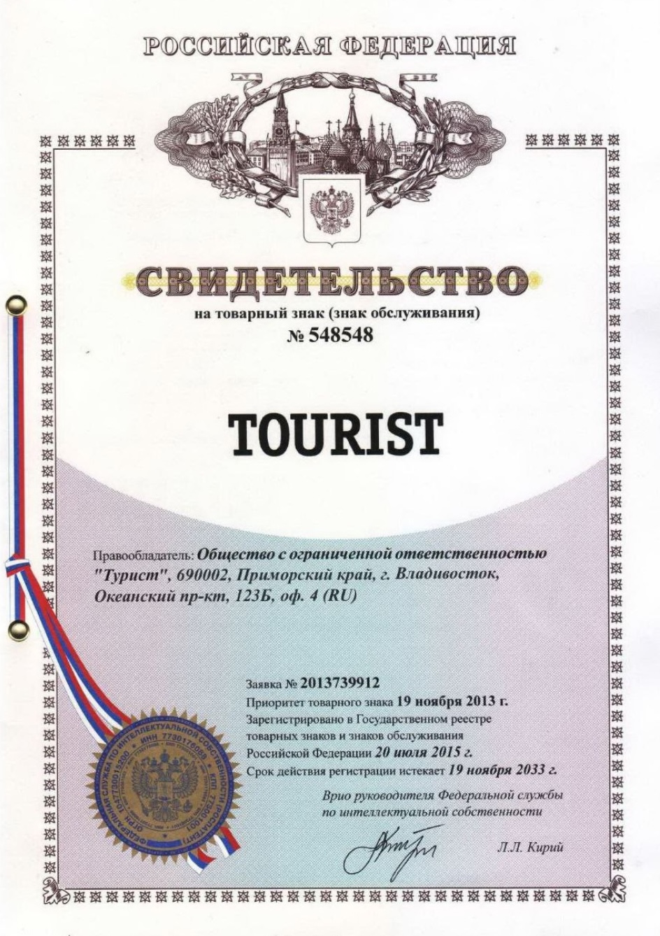 Торговая марка «TOURIST» (также как и транслитерация «ТУРИСТ») является официально зарегистрированной торговой маркой в Государственном реестре товарных знаков и знаков обслуживания Российской Федерации и является интеллектуальной собственностью ООО «Турист».