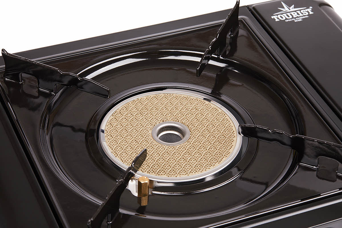 В некоторых моделях газовых обогревателей и плит марки «Tourist» используется уникальный микропористый керамический излучатель. К основным преимуществам керамики можно отнести более эффективную генерацию и распределение тепла за счет полного сгорания газовой смеси, отсутствие открытого пламени, что повышает безопасность прибора и препятствует задуванию пламени ветром во время работы, а также существенное снижение расхода газовой смеси.