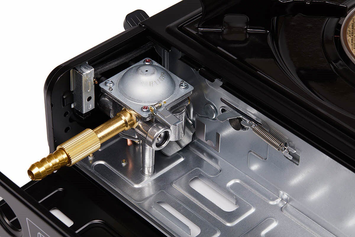Плита разработана специально для Российского рынка. Сочетает в себе все плюсы керамической конфорки и возможность работы как от стандартного одноразового газового баллона, который размещается внутри плиты, так и от бытового баллона объёмом 5–50 литров, который подсоединяется к плите шлангом. Керамическая конфорка обеспечивает отсутствие открытого огня, что повышает безопасность прибора и препятствует задуванию пламени ветром во время работы, а также существенно снижает расход газовой смеси. Транспортировка и переноска осуществляется в удобном пластиковом кейсе. Изготовлена в Южной Корее. Шланг, хомут и редуктор понижающего давления в комплект не входят.