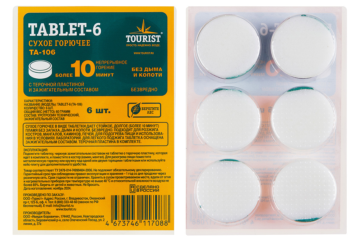Сухое горючее в виде таблетки дает стойкое, долгое (более 10 минут) пламя без запаха, дыма и копоти. Безвредно. Подходит для розжига костров, мангалов, каминов, печей, для подогрева пищи и использования в условиях лабораторий. Для легкого поджига таблетка оснащена зажигательным составом. Терочная пластина в комплекте.