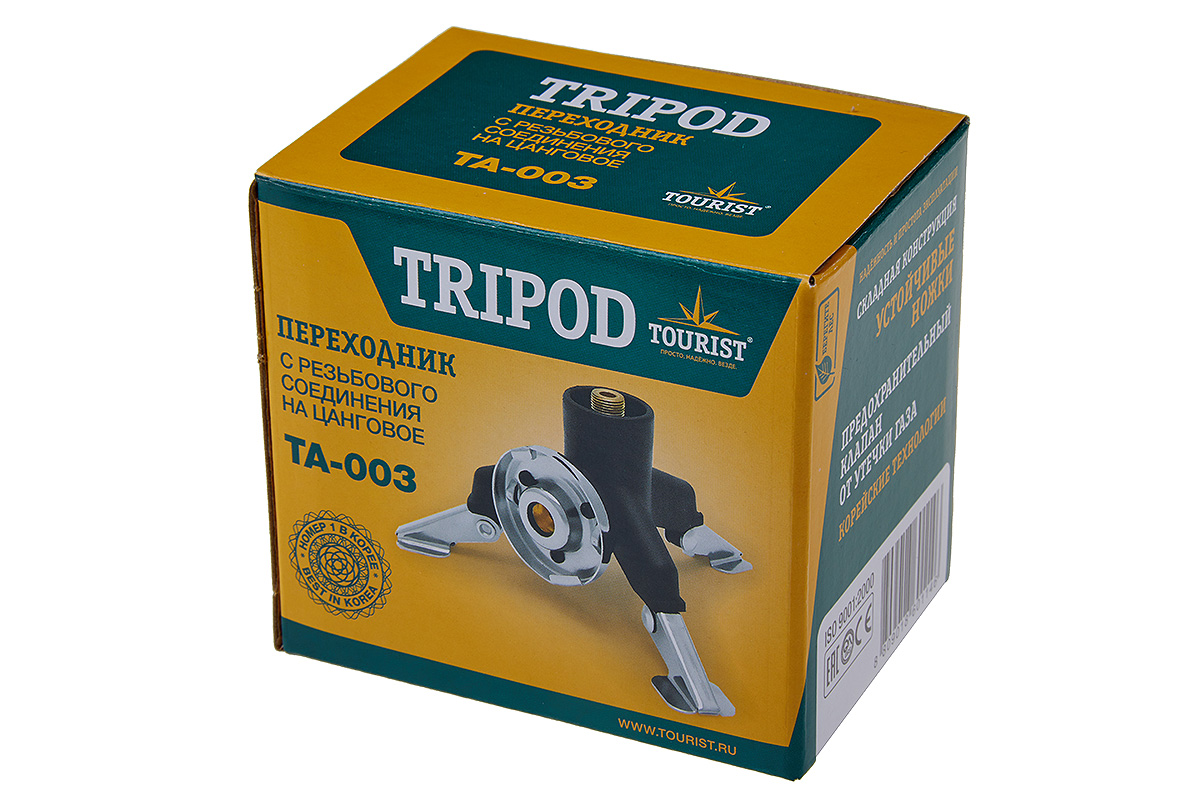 Компактный прибор Tripod (TA-003) представляет собой переходник-треногу, с помощью которого можно легко подключить портативные газовые приборы (плиты, светильники, горелки), использующие резьбовое соединение, к баллону с клапаном цангового типа. Изготовлен из высококачественных материалов, благодаря чему способен длительное время обеспечивать устойчивое соединение, не «стравливая» газ. Складная конструкция с удобными ножками обеспечит надежное положение газового устройства.